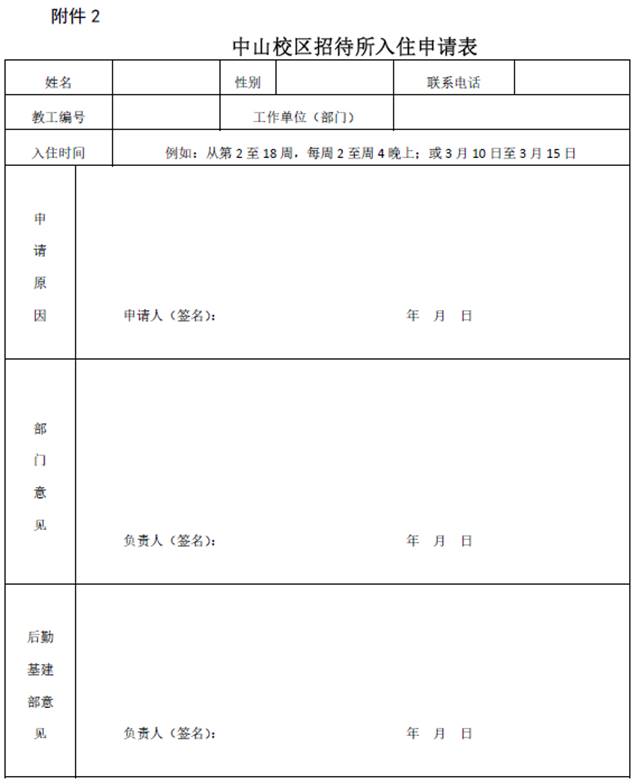 (二)连续入住2个晚上及以上的,须由本人提出申请,填报《中山校区招待所入住申请表》(附件2),经学院或部门主要负责人签名,再经后勤基建部审批同意后到前台办理入住。教职工每周有相同教学或其他工作任务而需要入住的,可按学期一次办理申请。