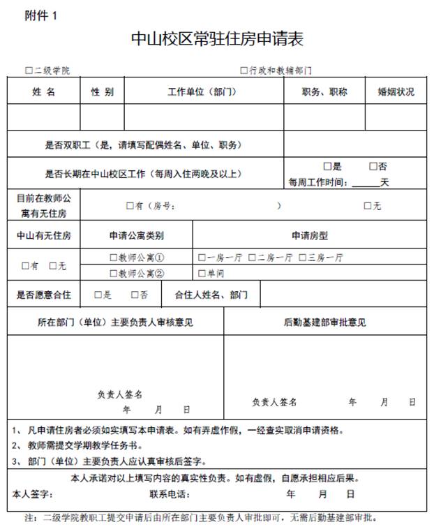 第九条 常驻住房的安排采用个人申请,面向行政、教辅人员每年集中一次申请,面向专任教师每学期集中一次申请,新进人员或岗位工作变动者可以根据实际情况提出申请。申请人填写《中山校区常驻住房申请表》(附件1),按以下方式提交申请审批: